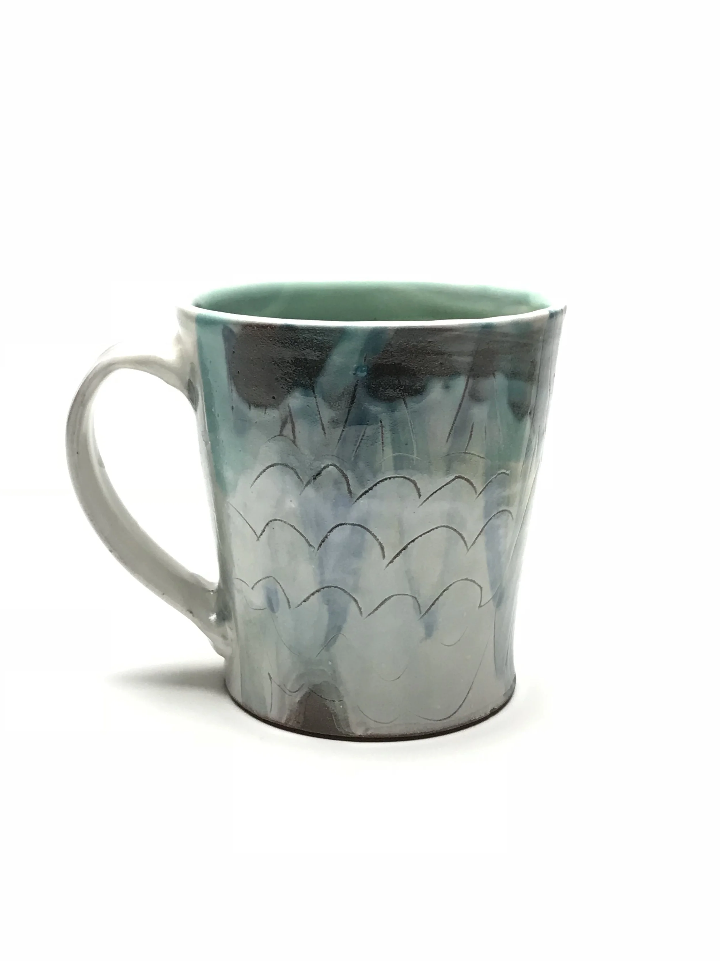 COFFEE MUG, 3.75 X 4 X 3.5", EARTHEN RED CLAY, SLIPS, UNDERGLAZE, GLAZE. 2018
