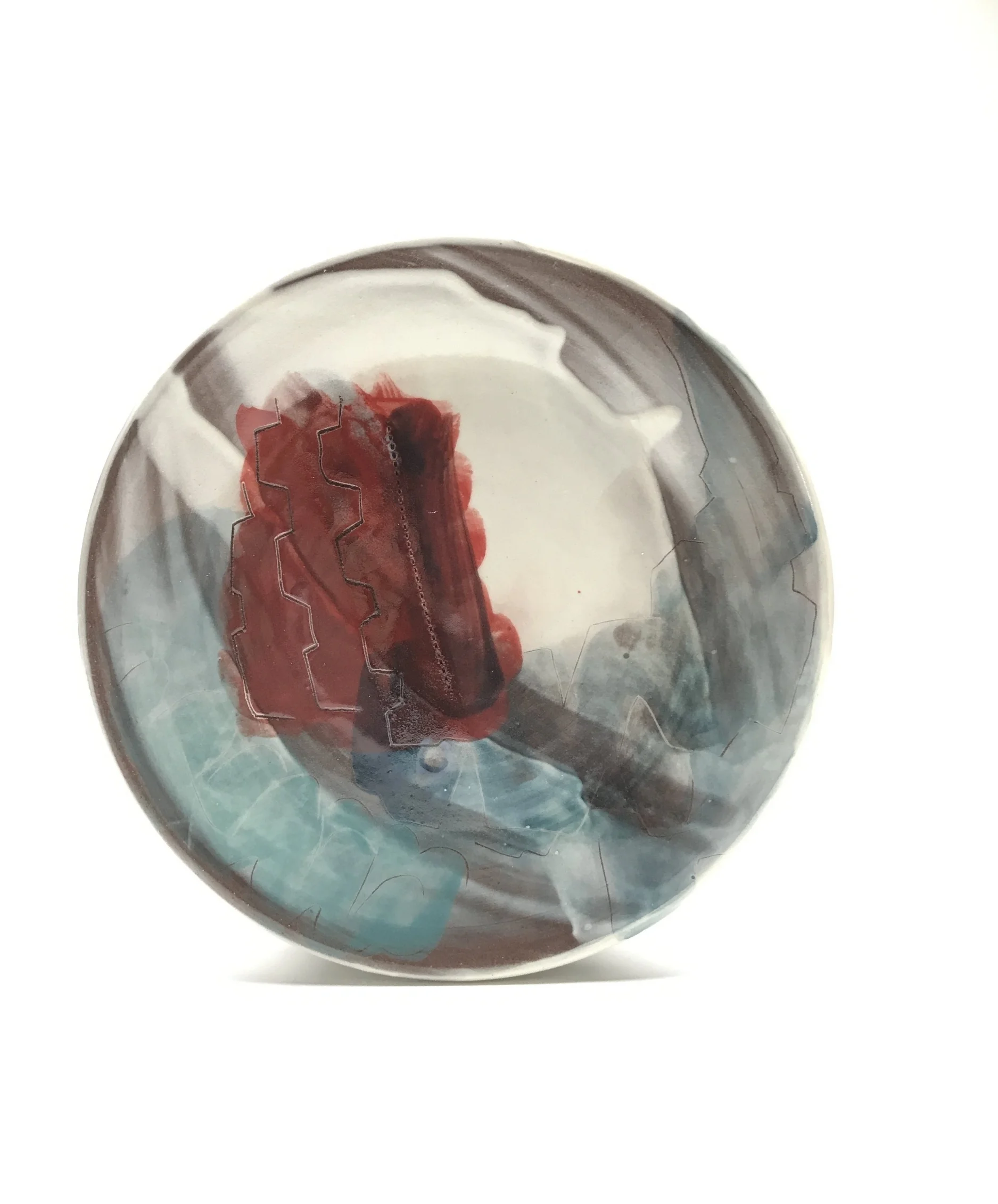 LUNCH PLATE, 1 X 8 X 8", EARTHEN RED CLAY, SLIPS, UNDERGLAZE, GLAZE. 2018